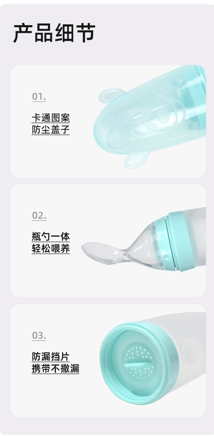 多功能性:除了作为勺子使用外,本产品还配备有可拆卸的瓶身部分,可作为小容量奶瓶或水杯使用,实现一物多用,方便实用。