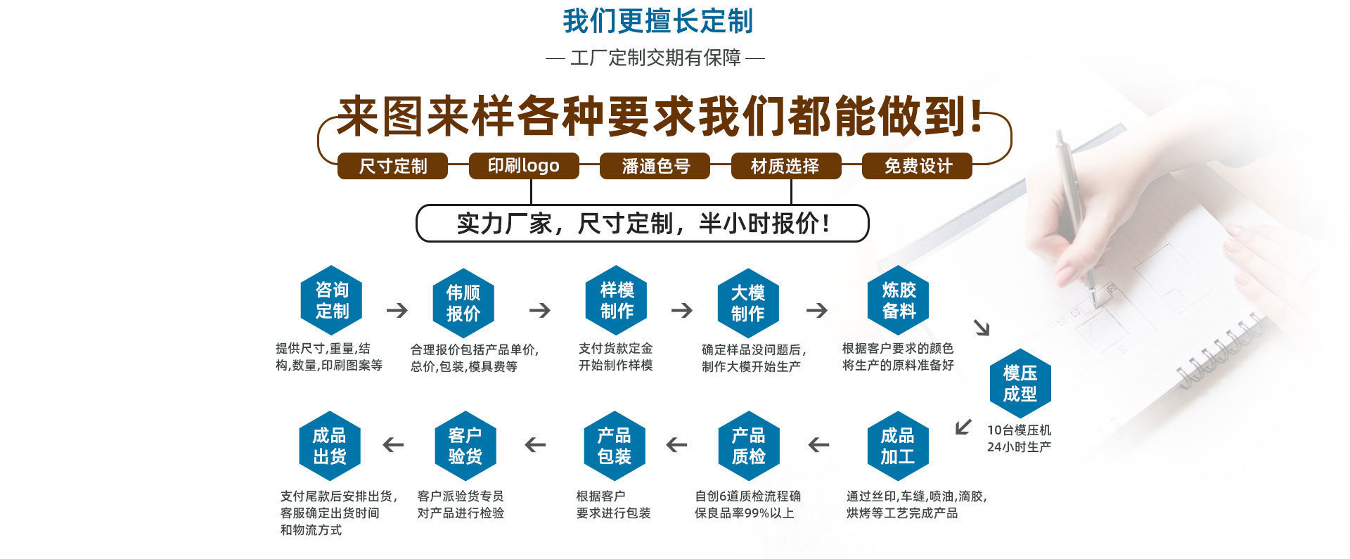 东莞伟顺是一家自营生产、设计、研发、销售为一体的民营东莞硅胶制品厂家,自有3000平米的生产基地,员工一百多人,月产硅胶制品20万件,硅胶厨具生产厂家拥有完整的设备设施,20台硅胶平板硫化机设备,硅胶套量产能力强大,质量保证。