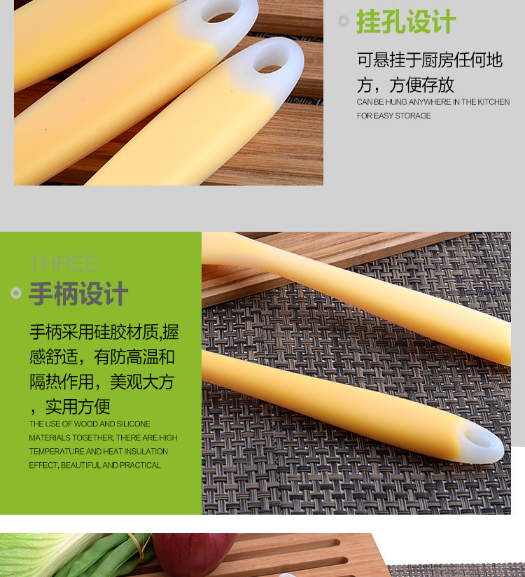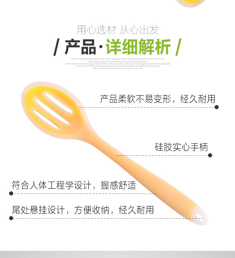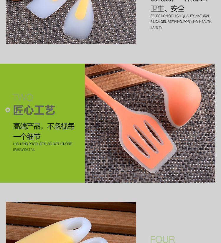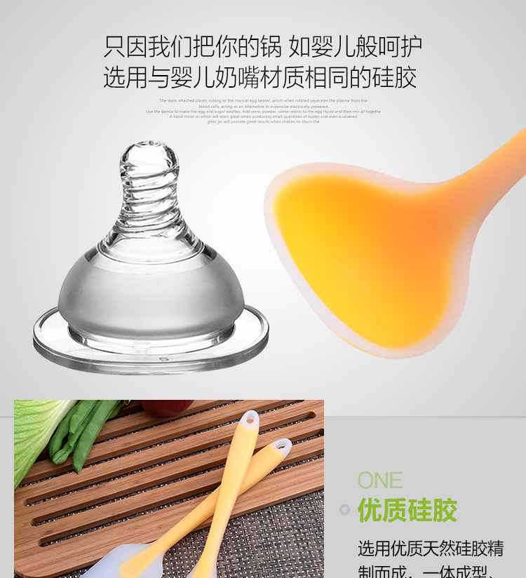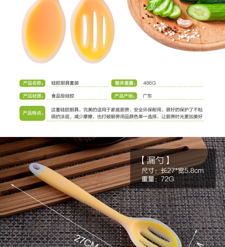 这套硅胶厨具完美的适用于家庭厨房,安全环保耐用,很好的?;ち?/li>