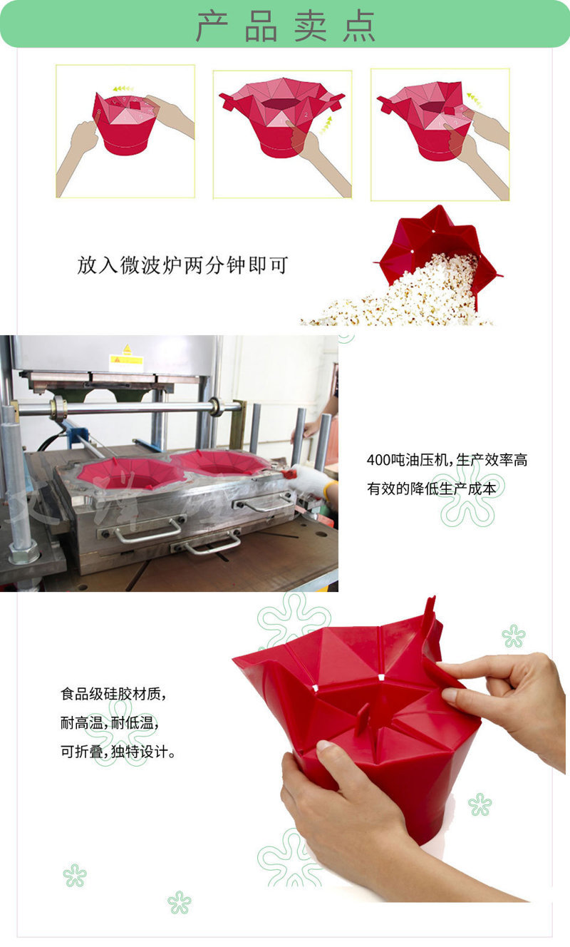 产品用途:适用于微波炉、冰箱,可重复使用的家用爆米花桶。